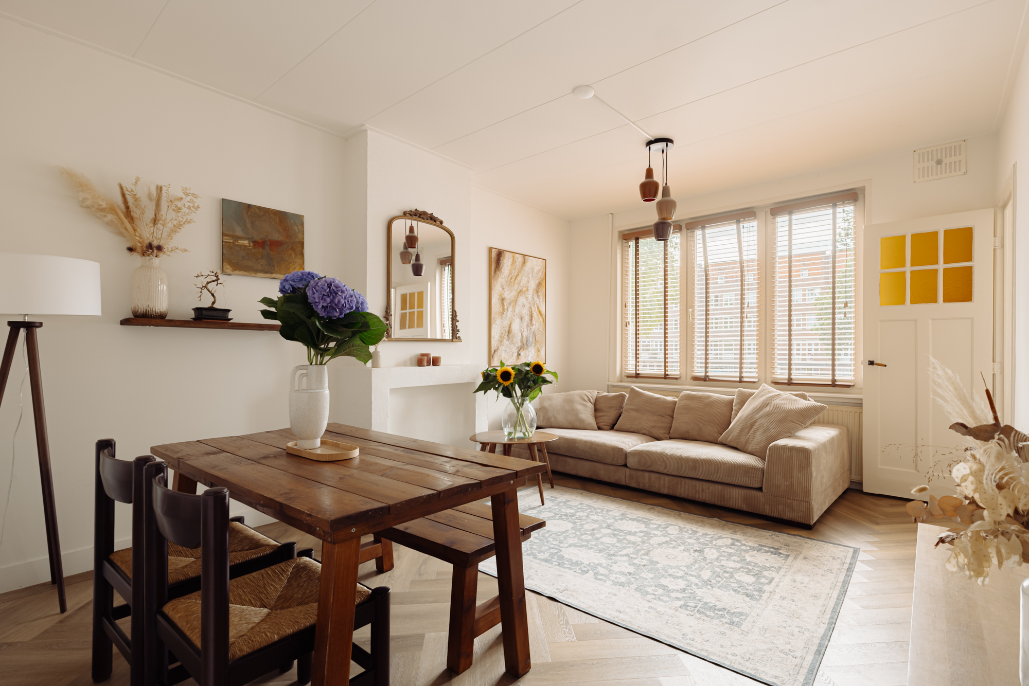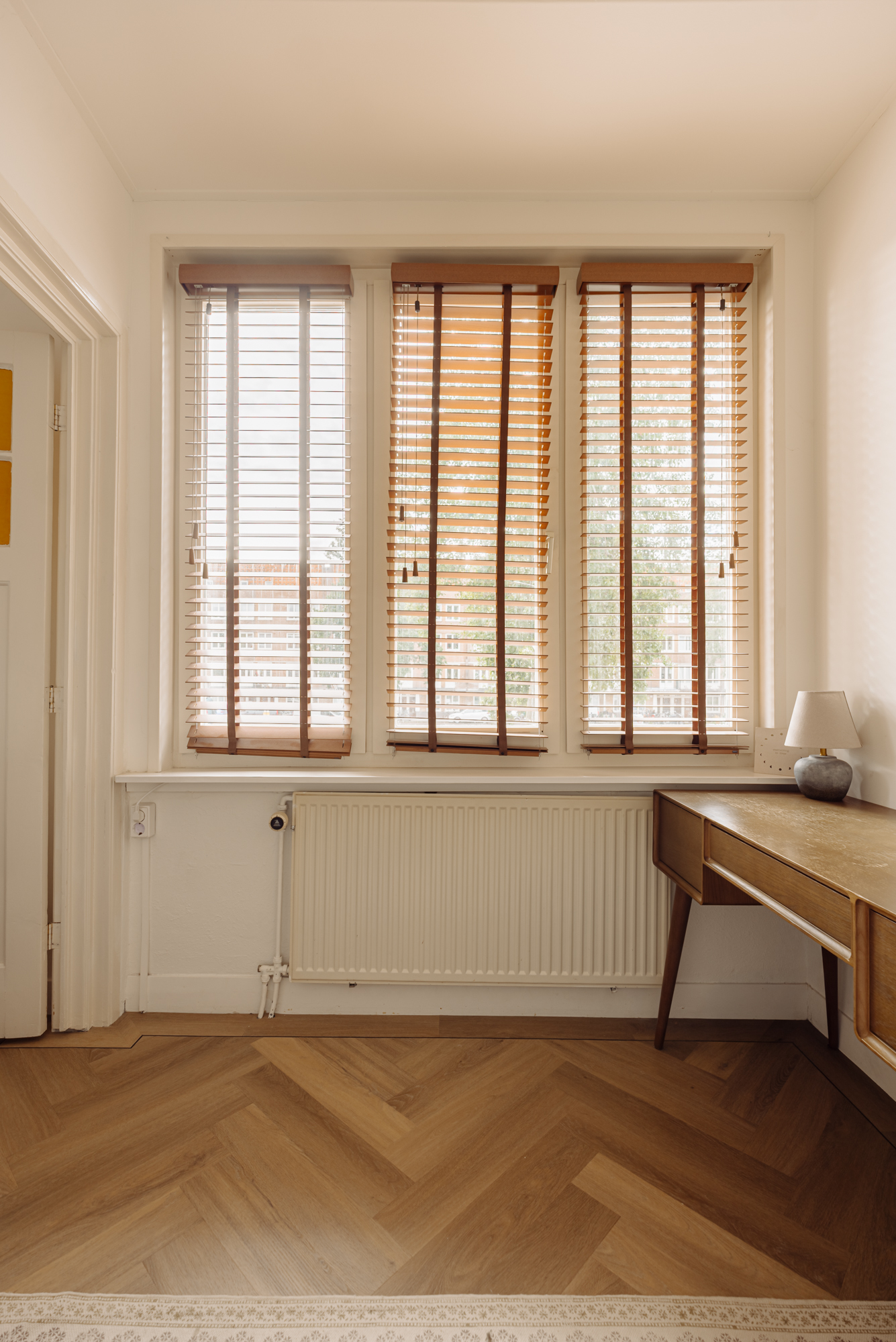 The bright and sunny living room offers a beautiful, tranquil view of the canal and the green strip. The entire apartment features an elegant oak herringbone floor, adding warmth and character to the home.