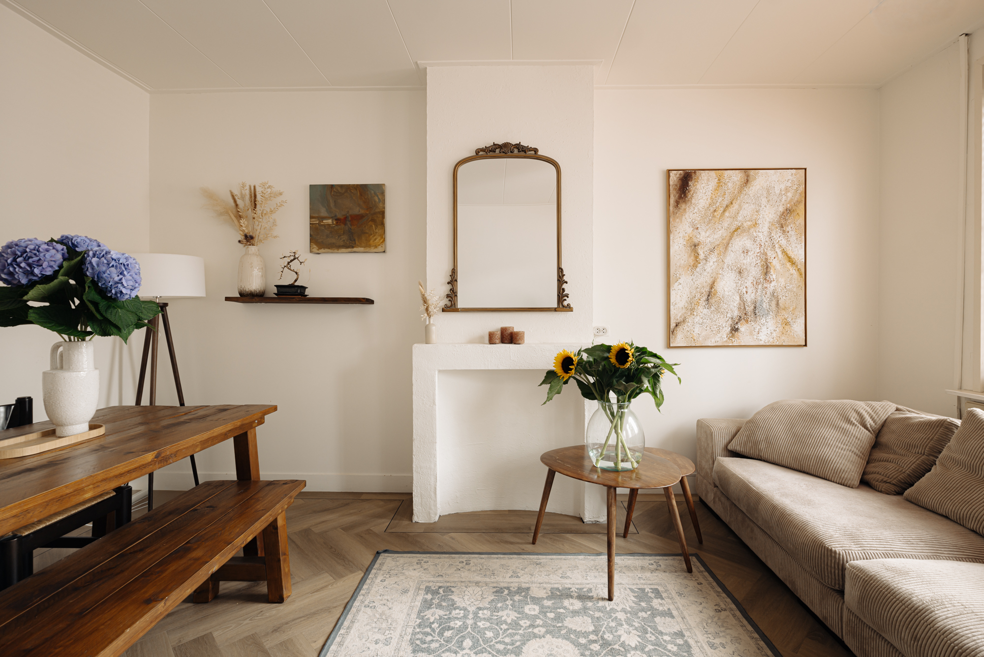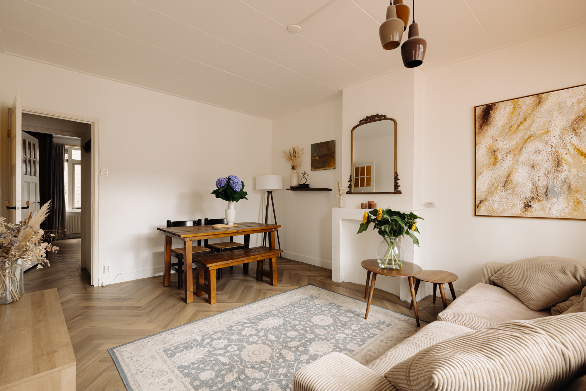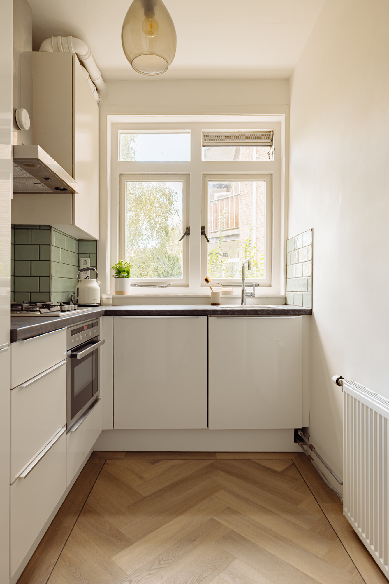 De lichte en zonnige woonkamer biedt een prachtig, rustgevend uitzicht op de gracht en de groene strook. Door de gehele woning ligt een fraaie eikenhouten visgraatvloer, wat het appartement extra karakter en warmte geeft.