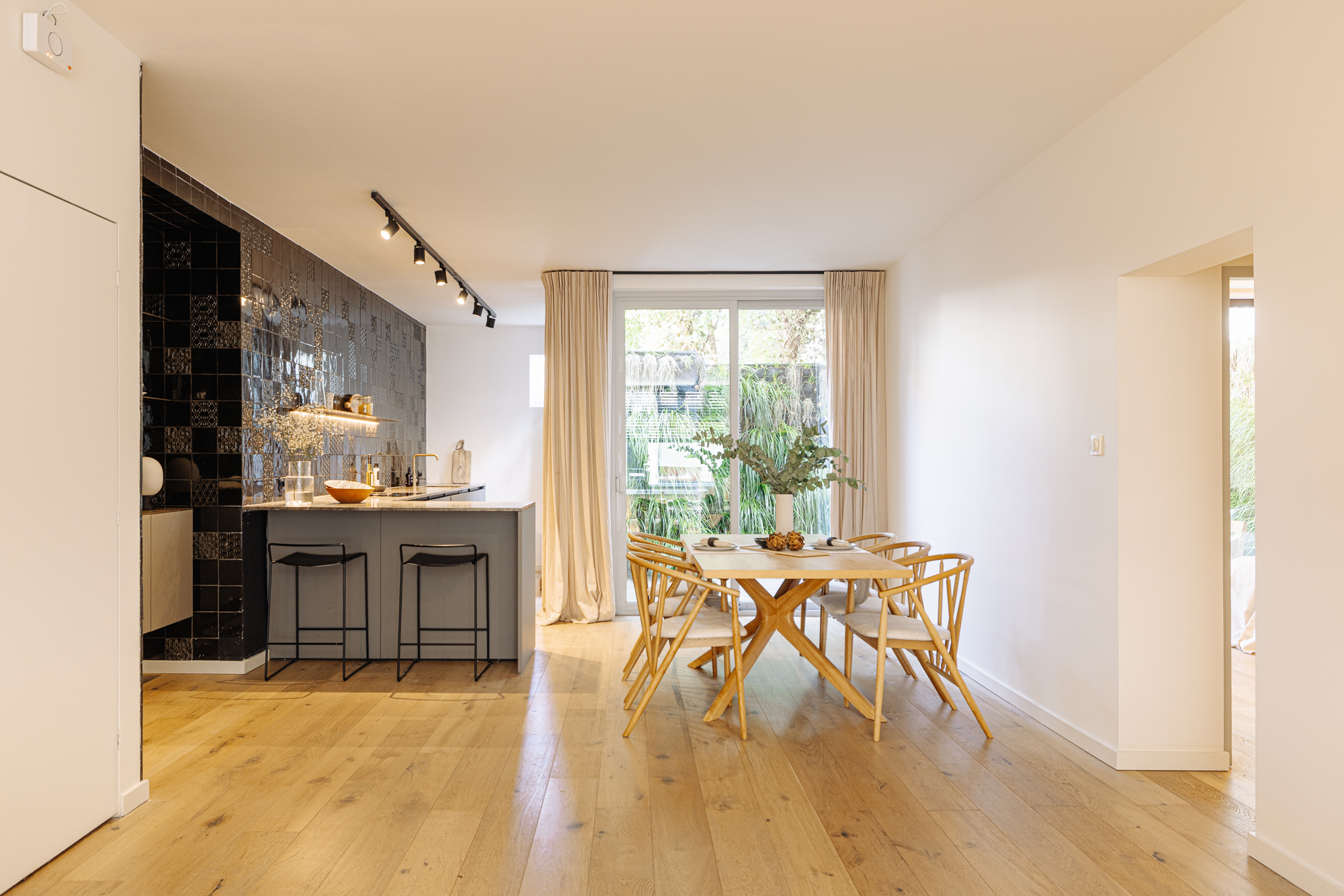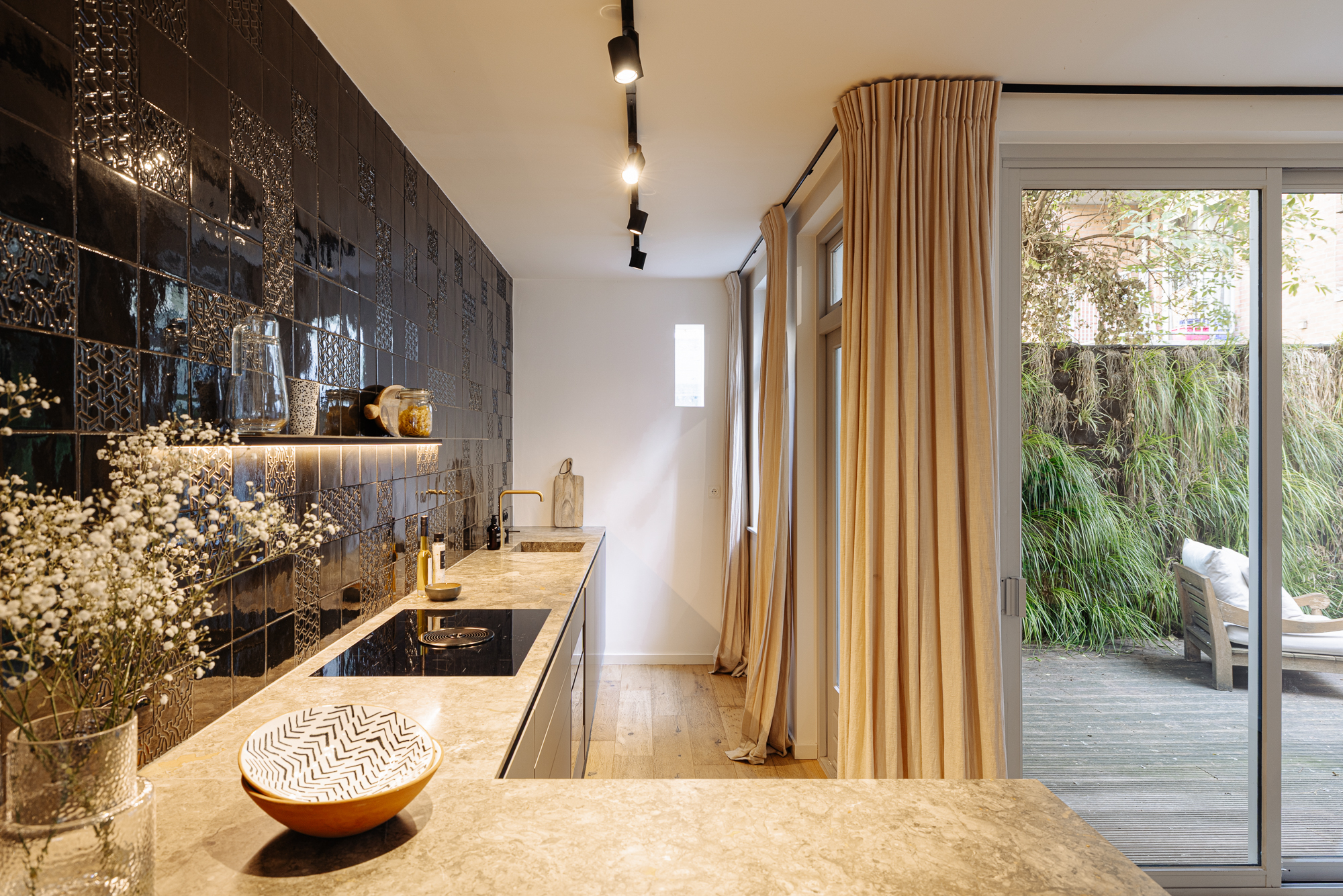 De woning beschikt over een eigen entree op de begane grond. Aan de voorzijde bevindt zich de sfeervolle, lichte woonkamer. Aan de achterzijde ligt het eetgedeelte met open keuken, dat doorloopt richting de tuin, met grote ramen die zorgen voor een natuurlijke verbinding tussen binnen en buiten. Links van de woonkamer bevindt zich een aparte berging met aansluitingen voor wasmachine en droger. De op maat gemaakte Boffi-keuken is geplaatst aan de tuinzijde en voorzien van een grijs marmeren werkblad en elegante gouden zwarte accenten.