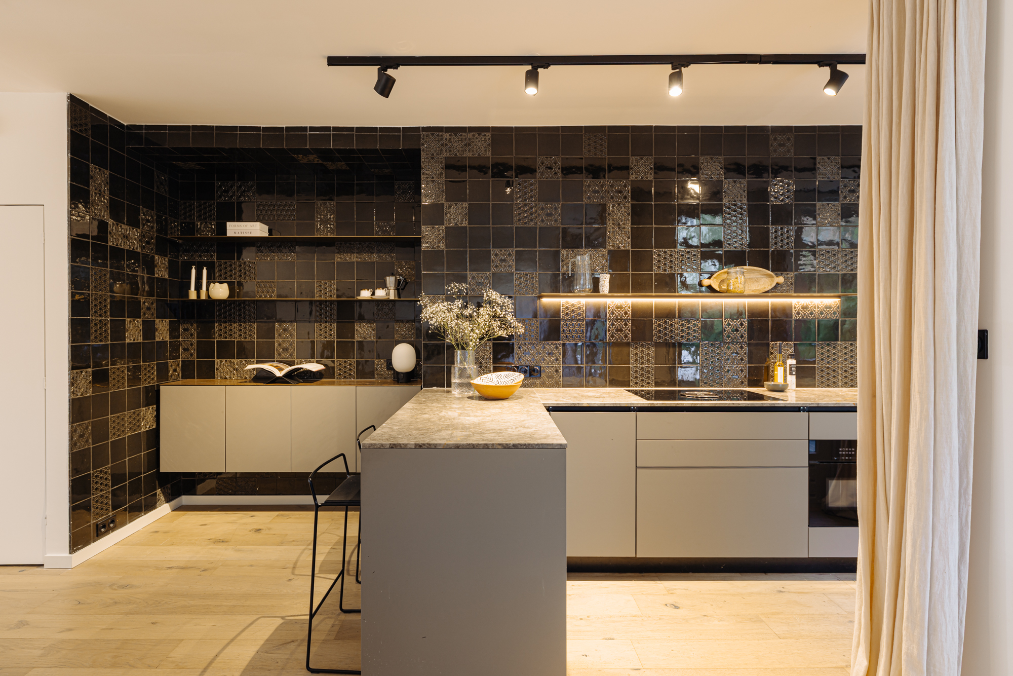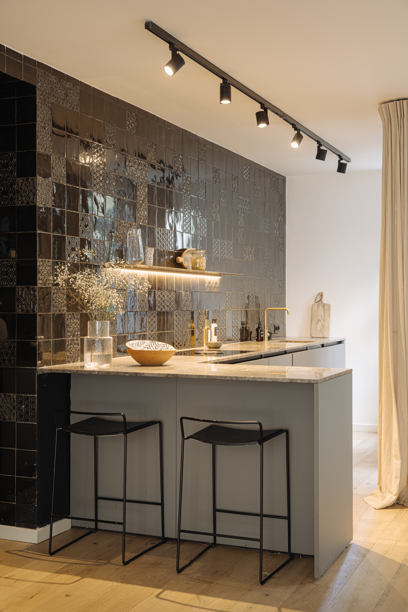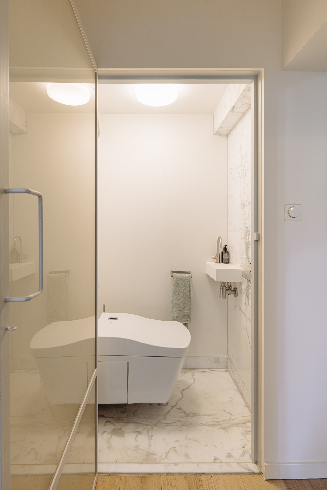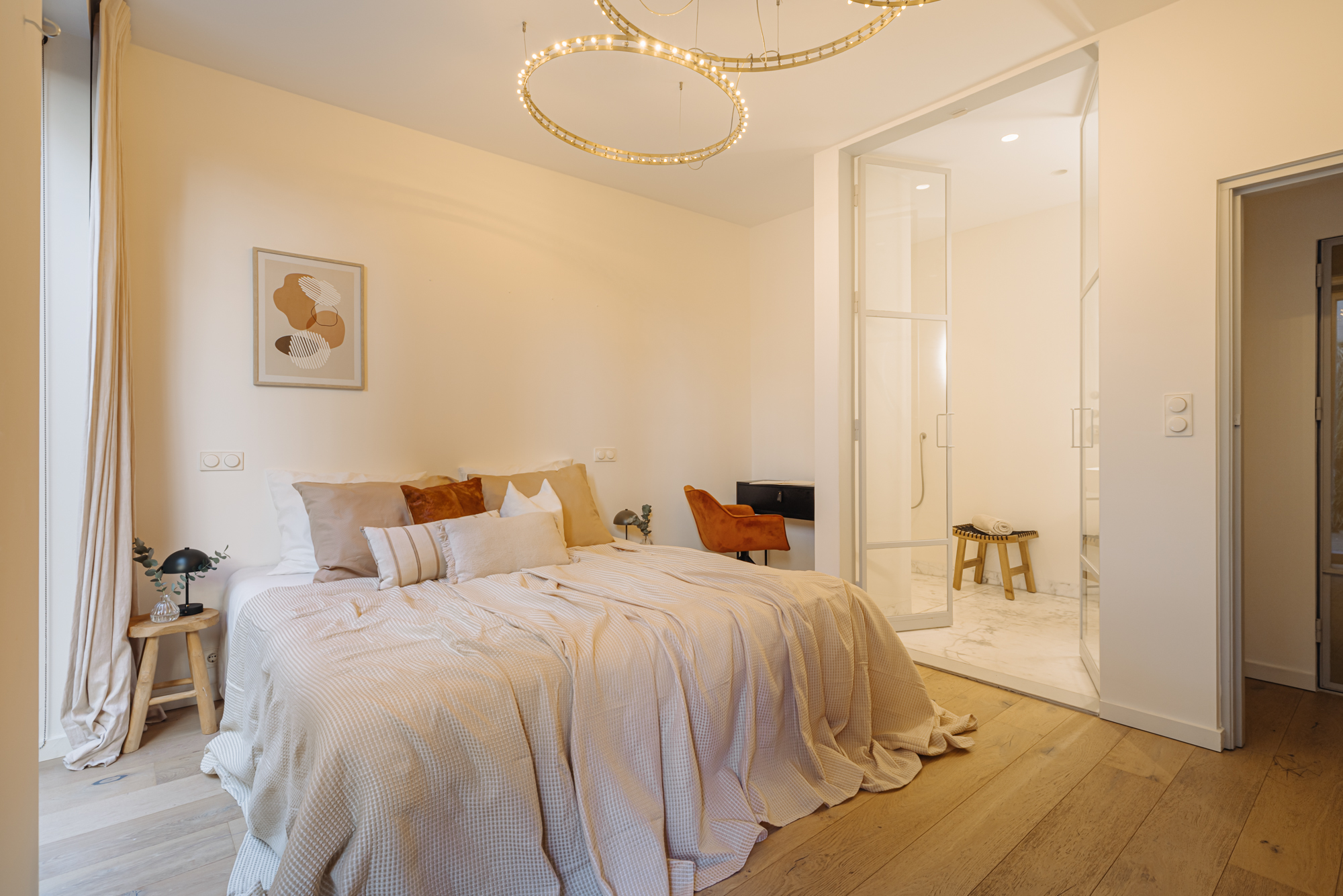 • Glass panels in the toilet and bedroom doors, featuring hand-stretched fabric in a brass tone, matching the elegant brass details throughout the interior;