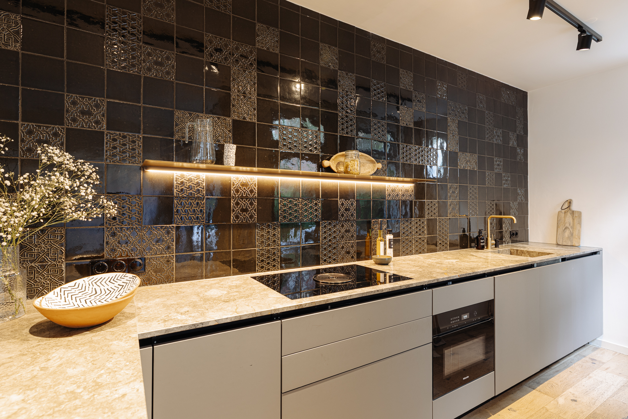 • An Italian designer kitchen by Boffi, equipped with built-in Miele appliances and a bar;