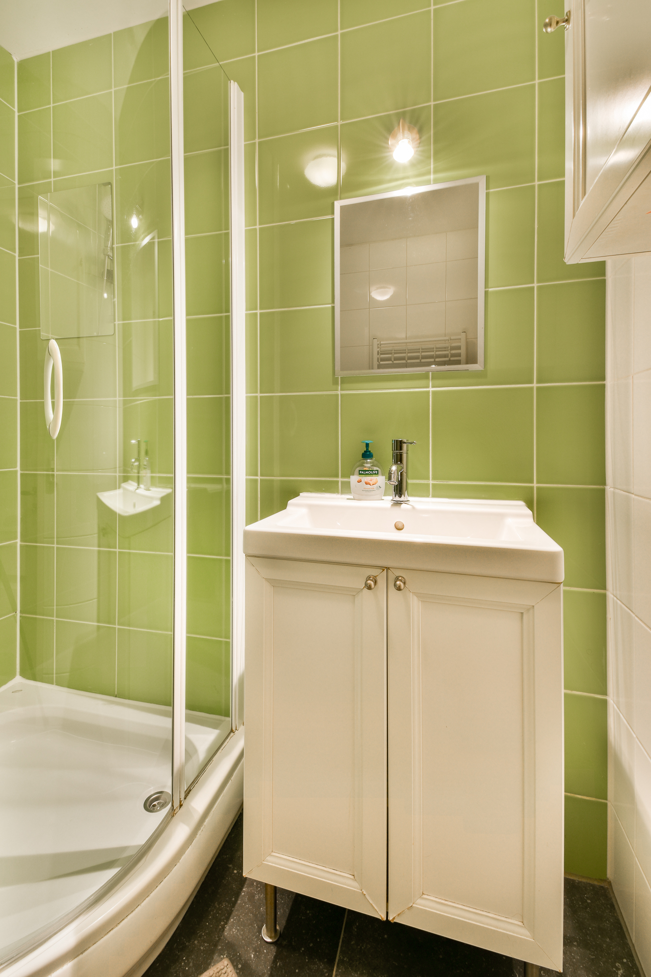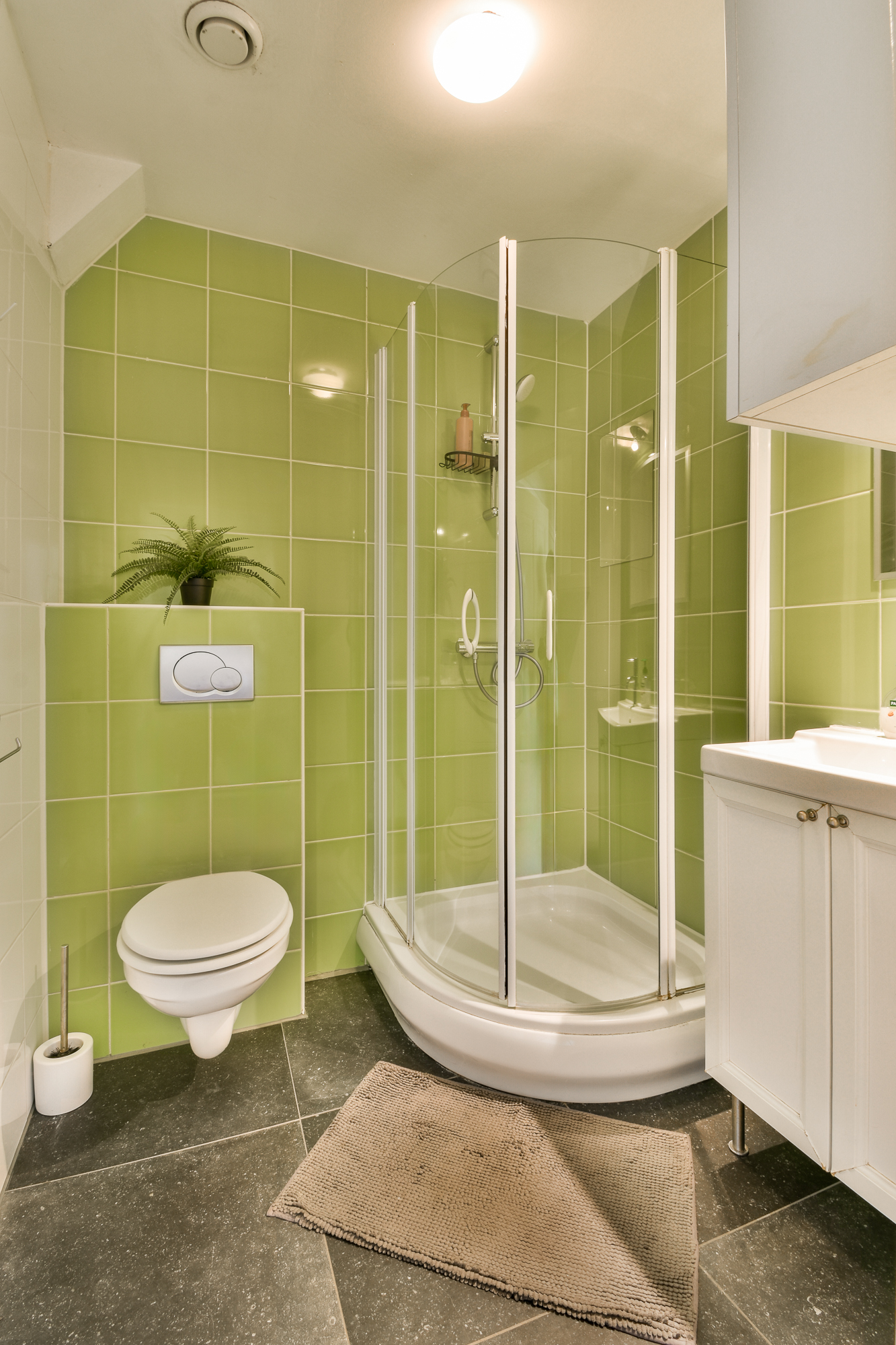 The spacious, covered balcony is located at the rear of the building and offers a peaceful retreat. The bathroom is fitted with a floating toilet, a washbasin with vanity unit, and a shower cabin.