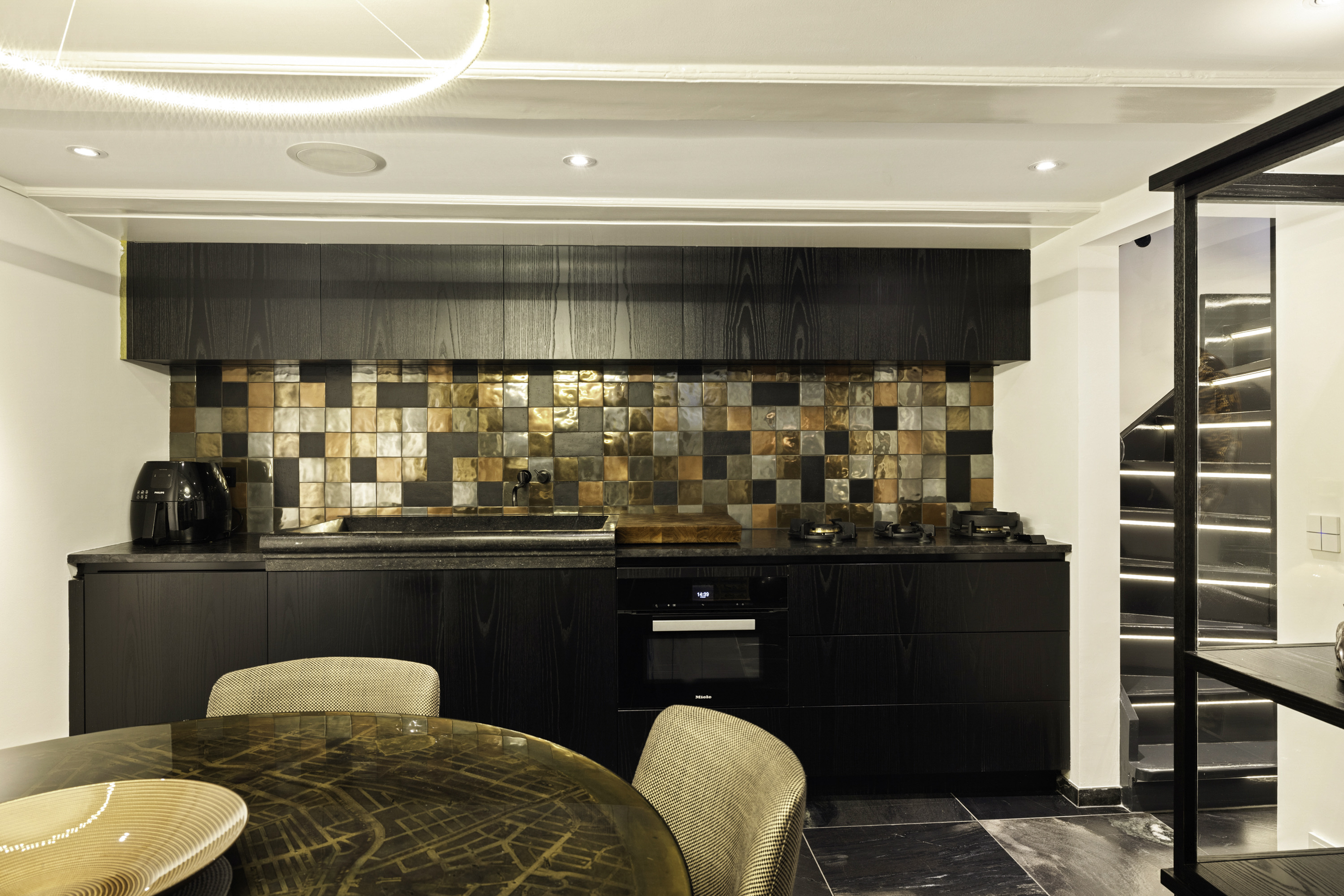 Bij binnenkomst via dubbele deuren op de begane grond komt u in de ruime en lichte woonkamer, die wordt gekarakteriseerd door hoge balkenplafonds en een sfeervolle gashaard. De woonkamer biedt een heerlijk lichte en open ruimte die uitnodigt tot ontspanning. Vanuit de woonkamer heeft u toegang tot het souterrain, waar zich de luxe woonkeuken bevindt. Deze is voorzien van topkwaliteit inbouwapparatuur van merken zoals Miele (combi-oven, vaatwasser) en Siemens (koelkast), en een aparte wasruimte met een Miele was-/droogcombinatie. Dit souterrain biedt niet alleen een uitstekende keukenruimte, maar ook voldoende opbergruimte en praktische indeling.