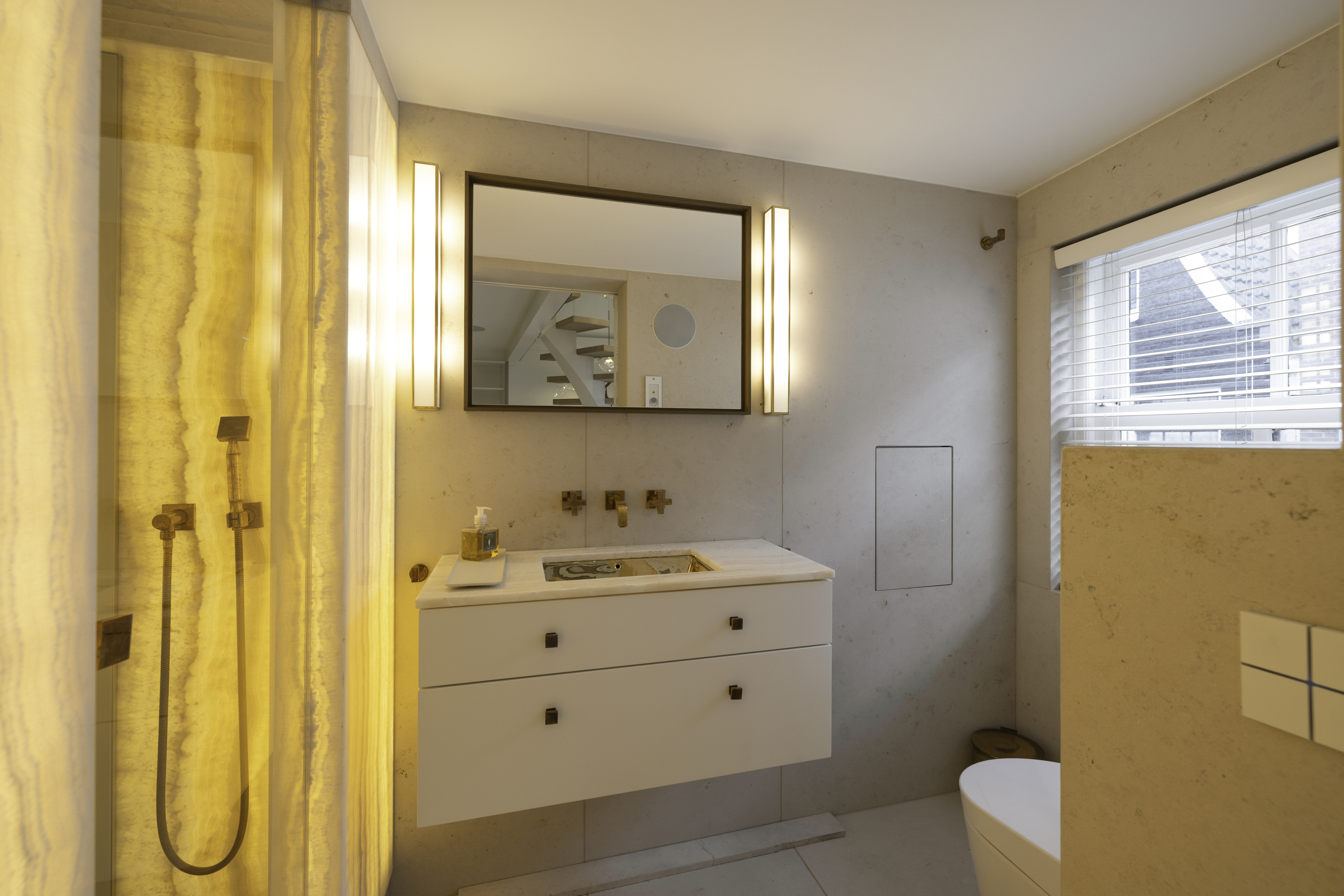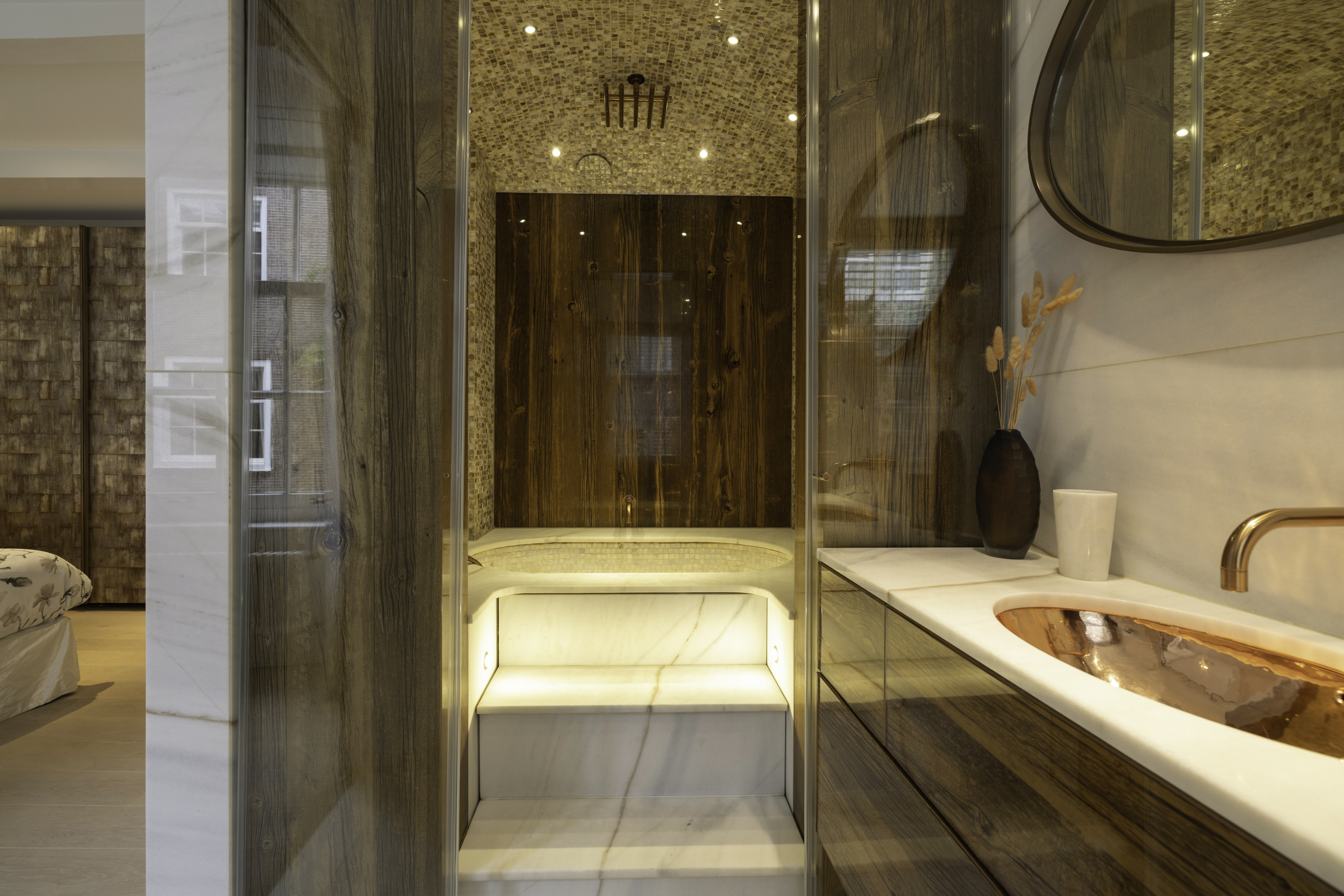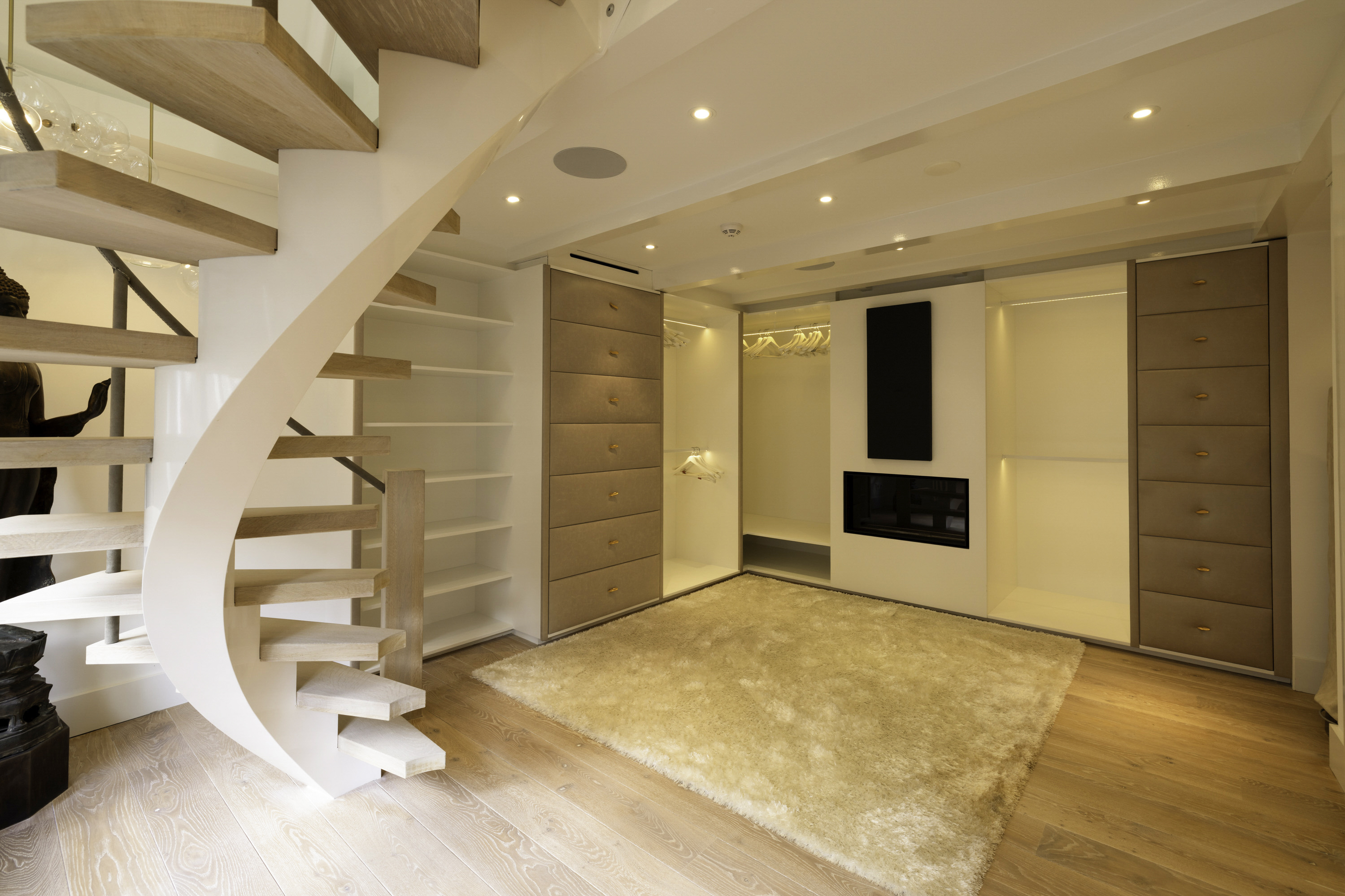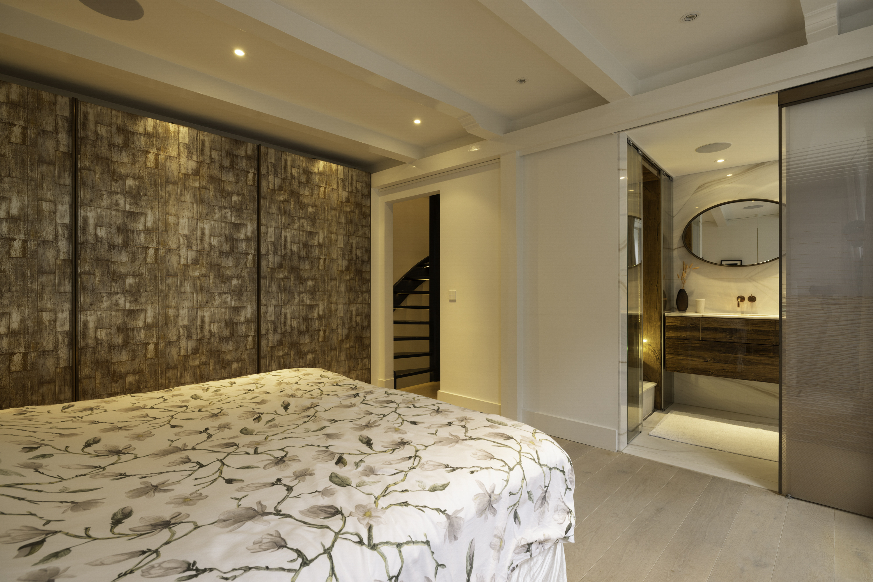 The first floor features a spacious bedroom, equipped with built-in wardrobes for optimal use of space. The bedroom has an en-suite bathroom, which is finished to a high standard with a rain shower, steam function, and vanity unit. The design is sleek and modern, creating a sense of luxury and privacy.