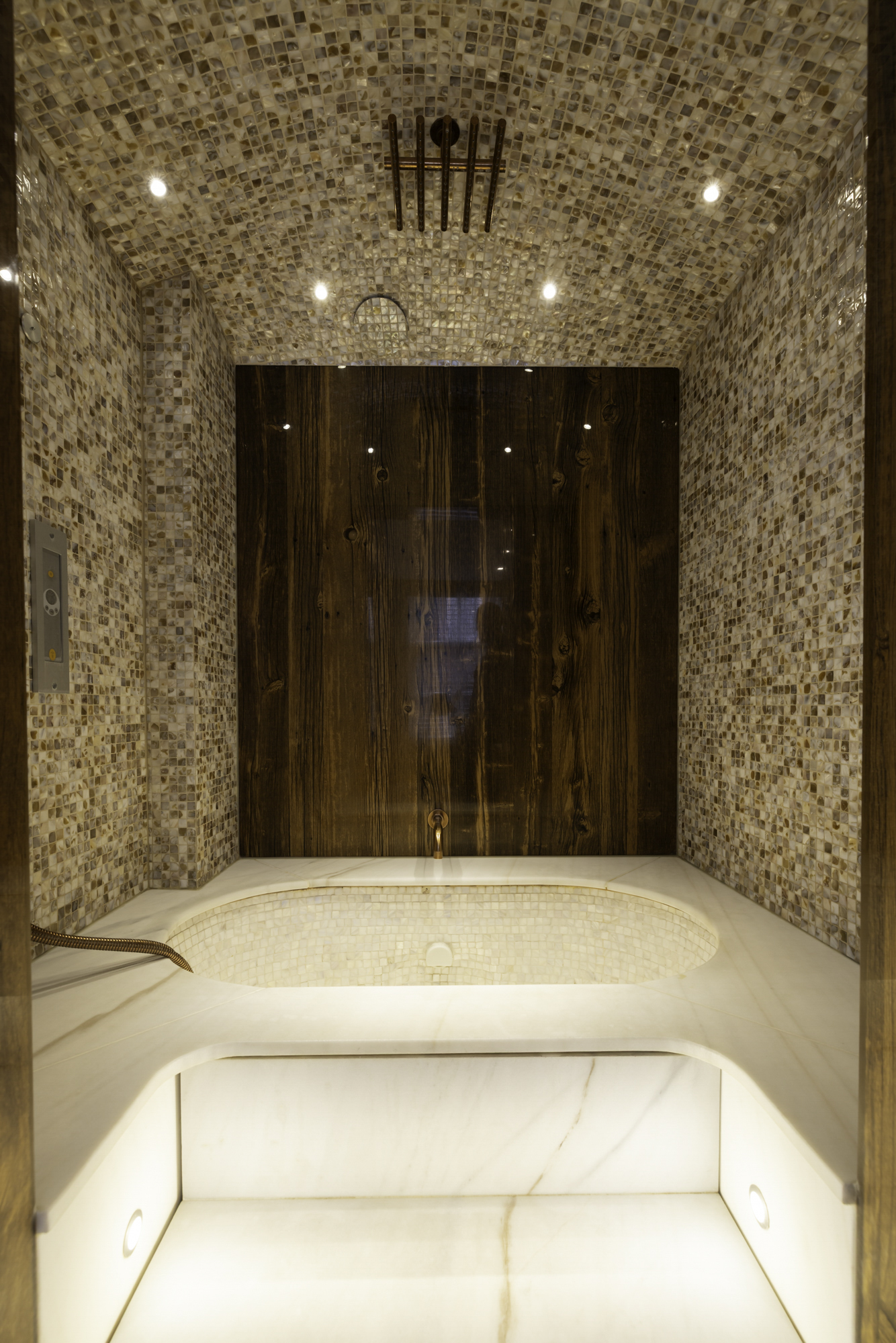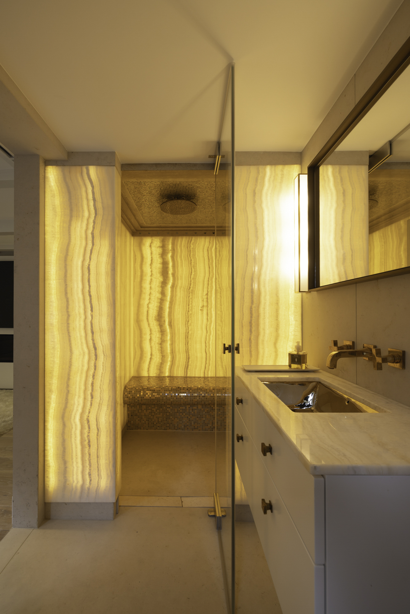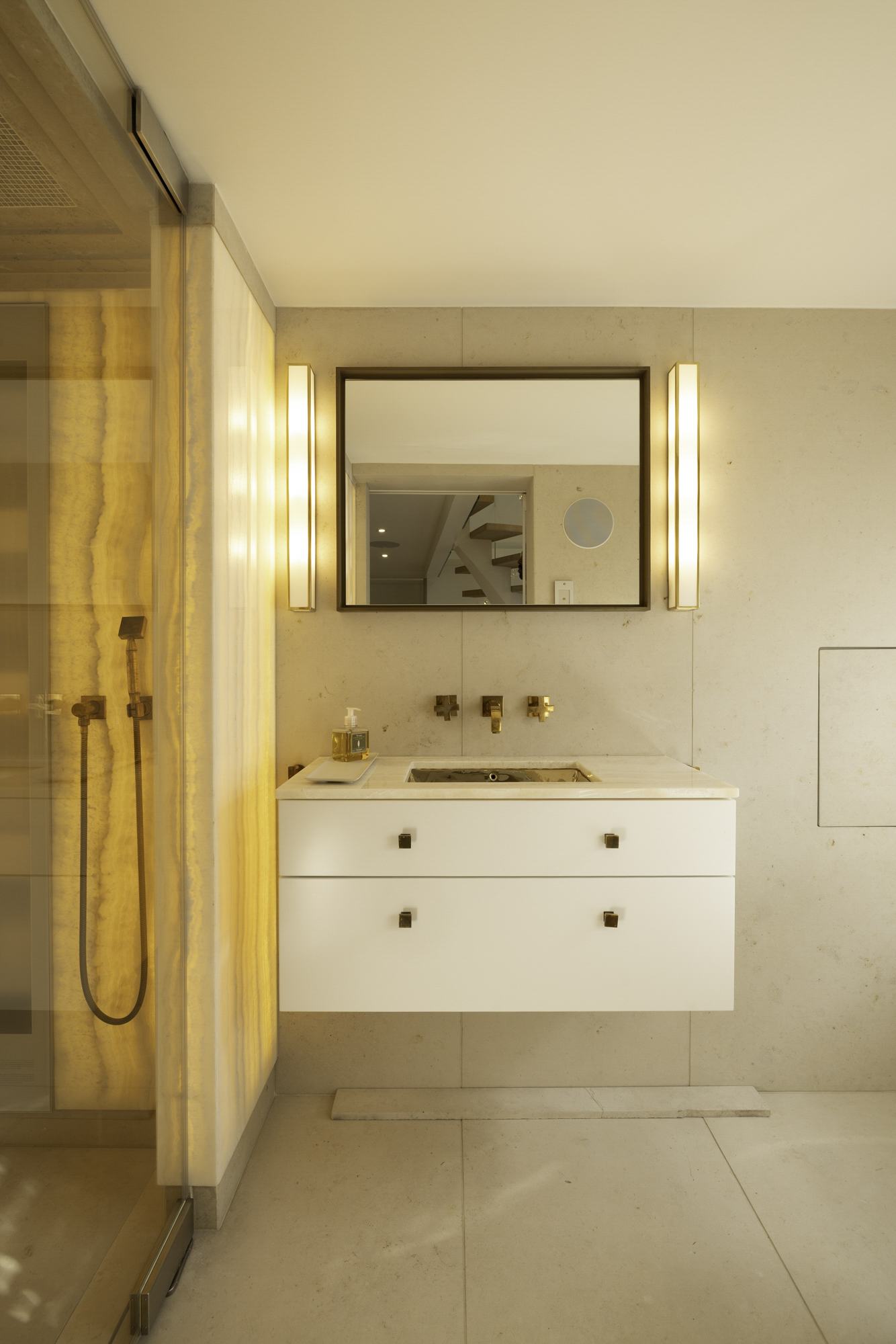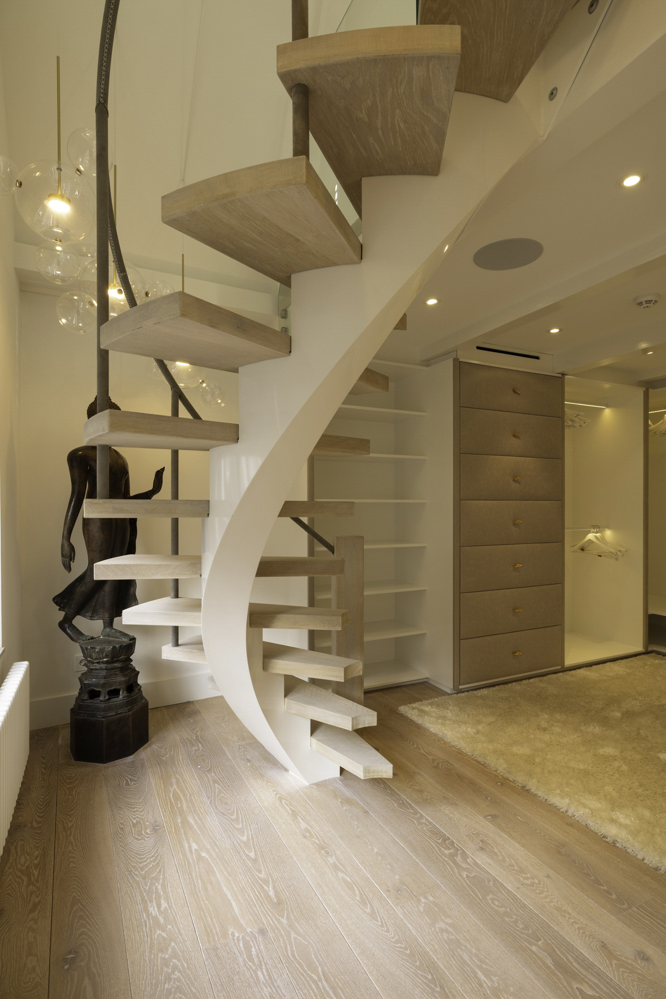 The first floor features a spacious bedroom, equipped with built-in wardrobes for optimal use of space. The bedroom has an en-suite bathroom, which is finished to a high standard with a rain shower, steam function, and vanity unit. The design is sleek and modern, creating a sense of luxury and privacy.