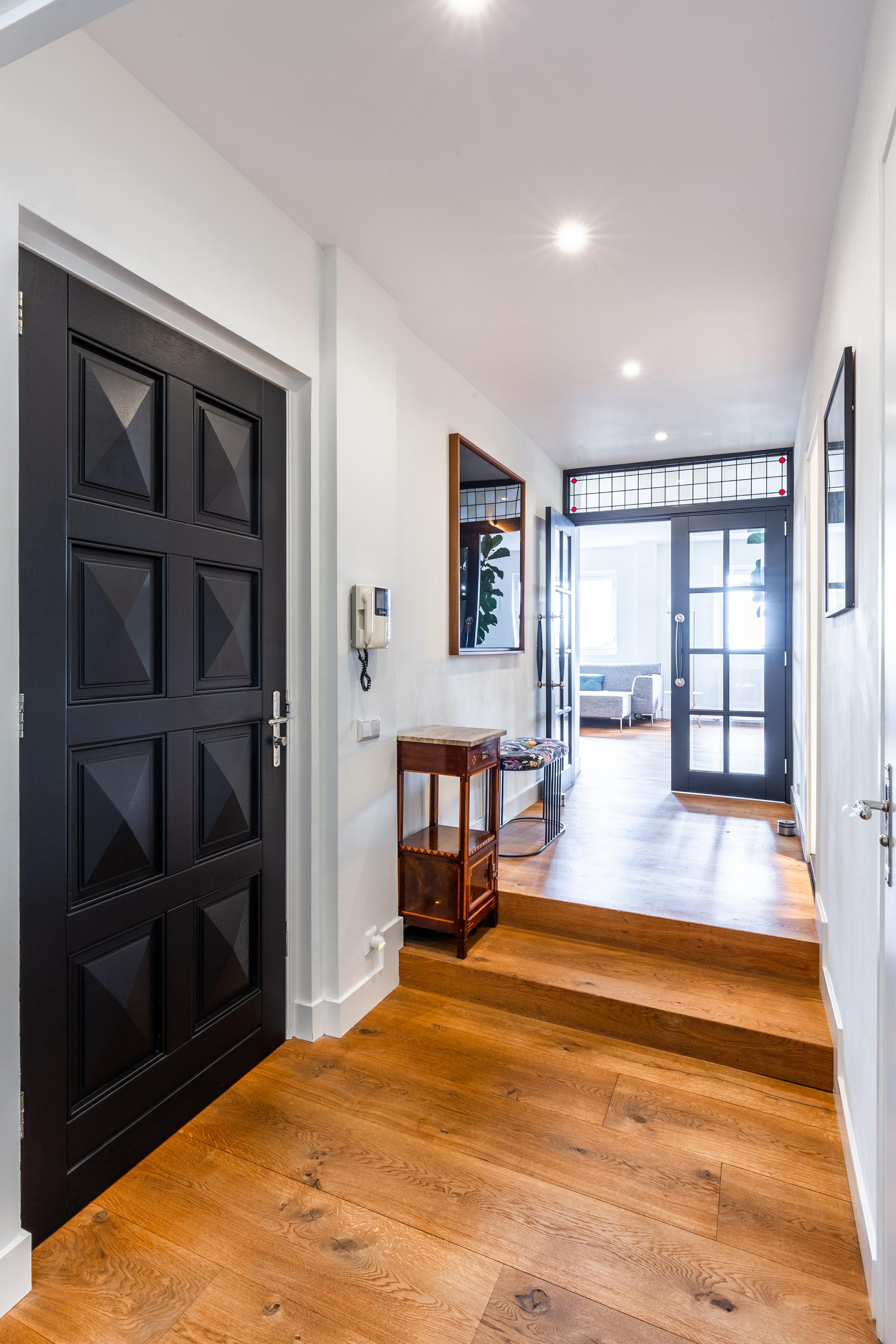 - Glas-in-lood raam en openslaande deuren vanuit de gang