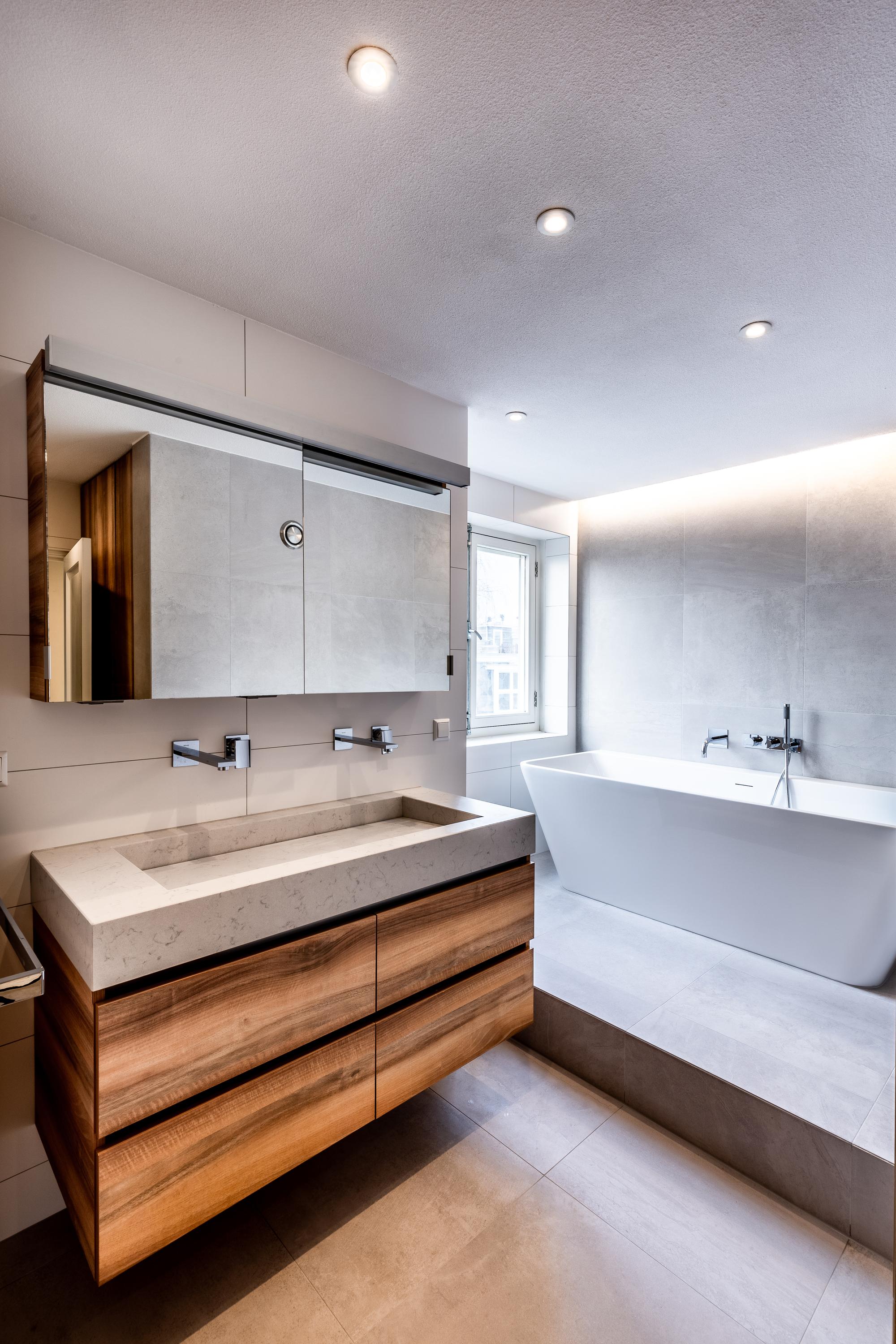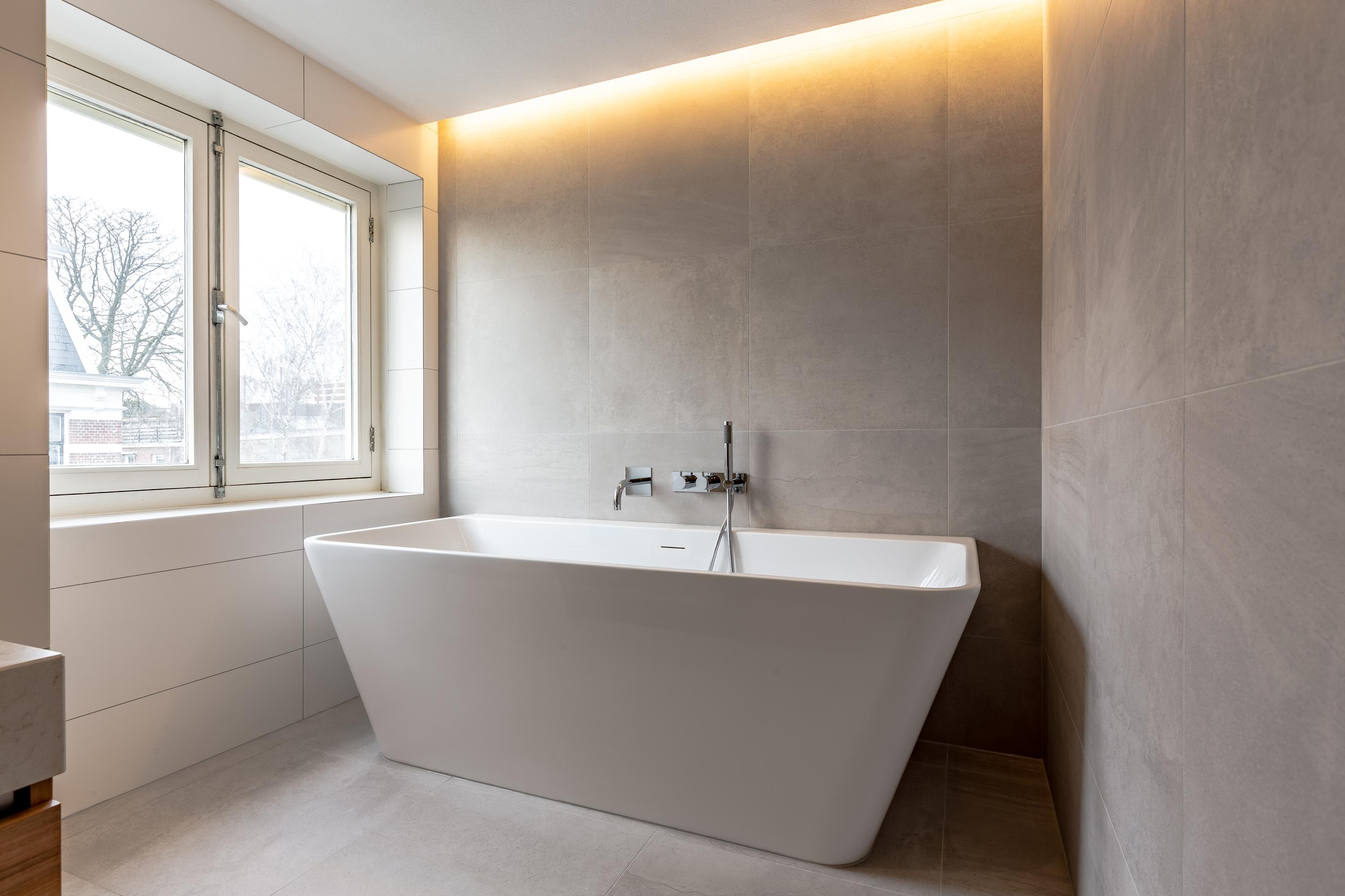 - Grote badkamer met ligbad, tweepersoons wastafel, raam en aparte